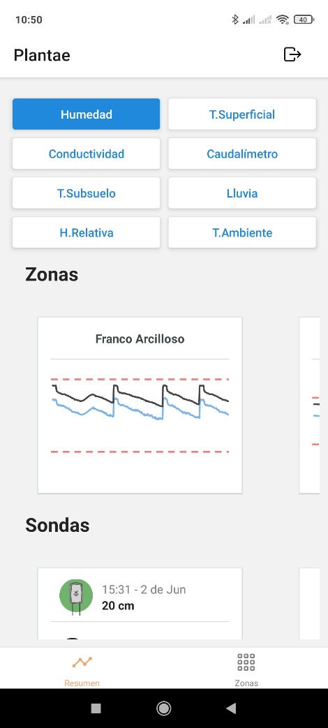 Al entrar, accederemos a la pantalla principal de la APP, en la que directamente veremos la evolución de los parámetros en cada zona y los datos de cada sonda.